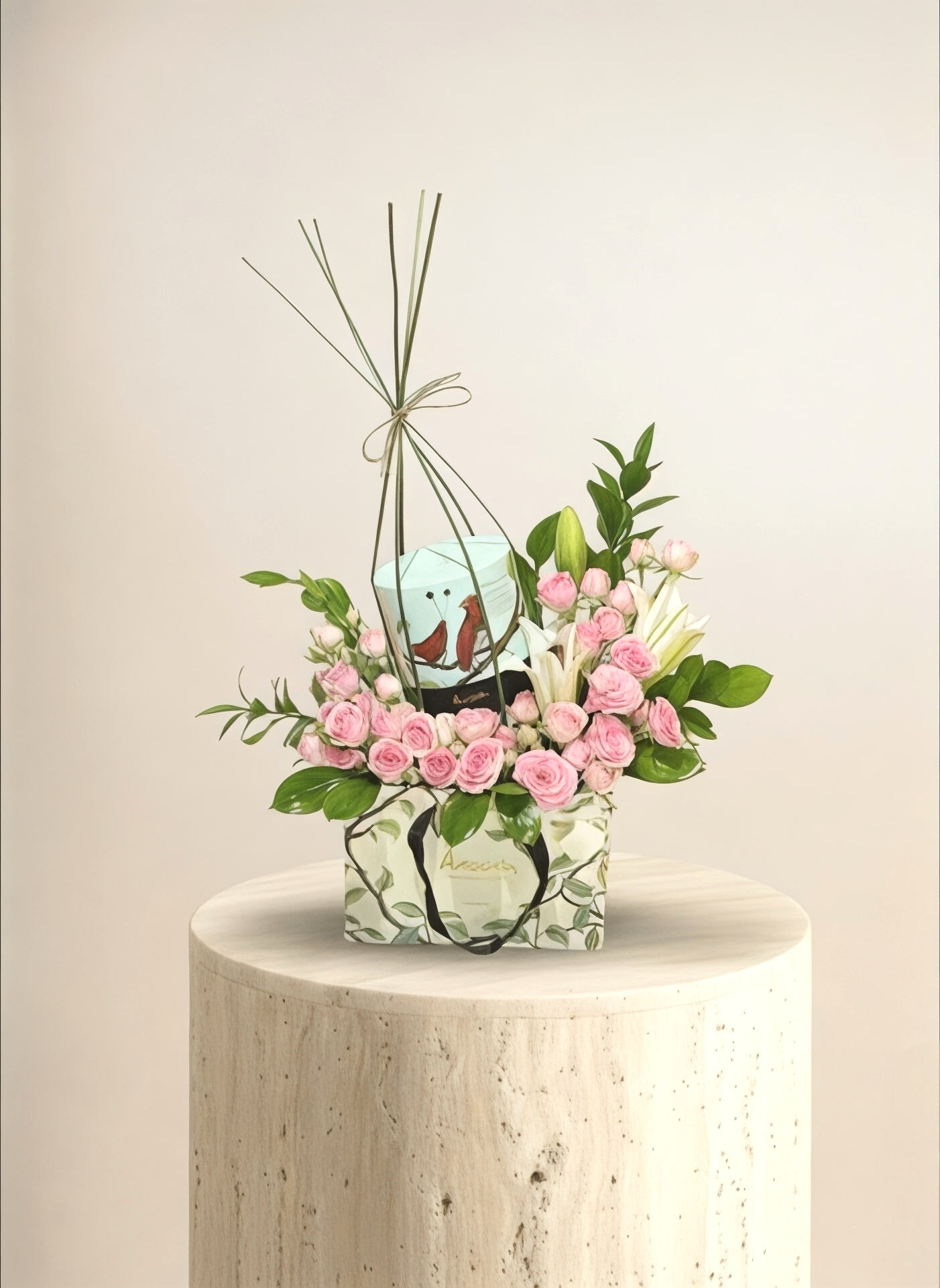 يتميز هذا التنسيق بتناغم ساحر بين الزنابق البيضاء المتفتحة التي تضفي لمسة من الرقي والفخامة، وأزهار الجوري الوردي الناعمة (بيبي روز) التي تعبر عن أرق المشاعر، وكلها محاطة بأوراق خضراء نضرة.