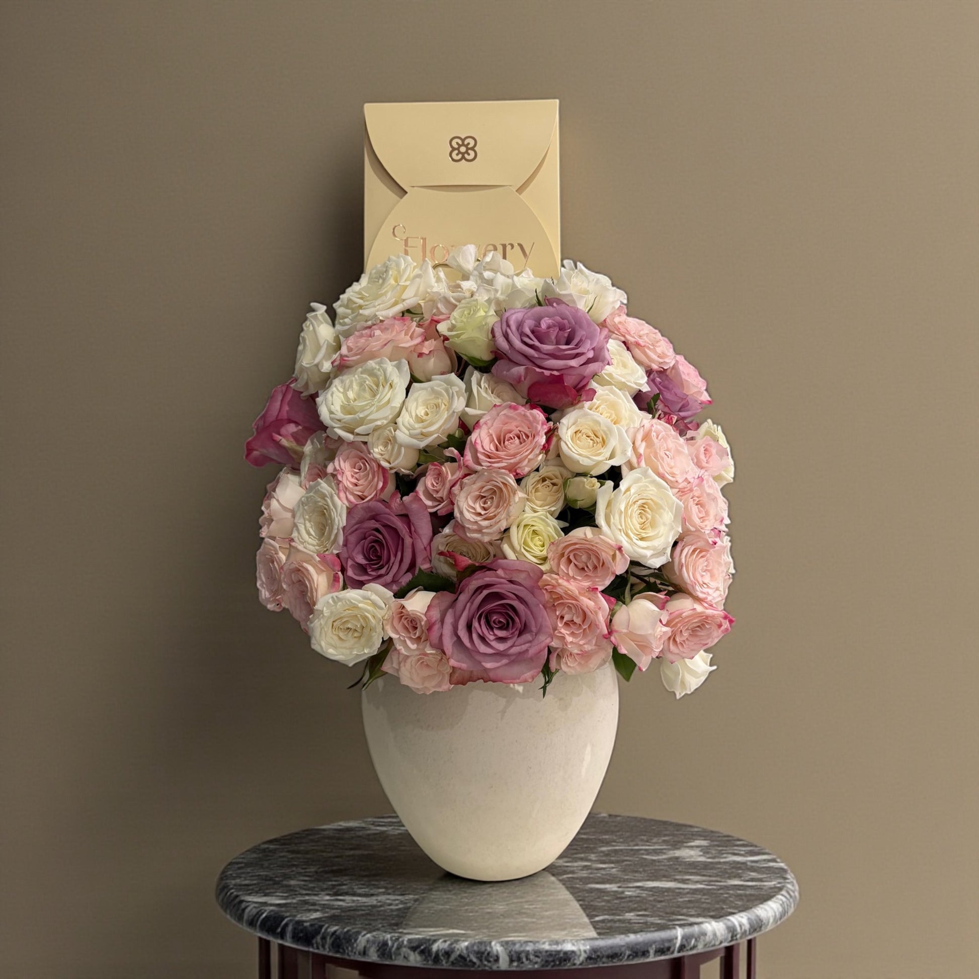 A masterpiece that combines the elegance of roses and the luxury of arrangement in breathtaking harmony. This distinctive bouquet includes: