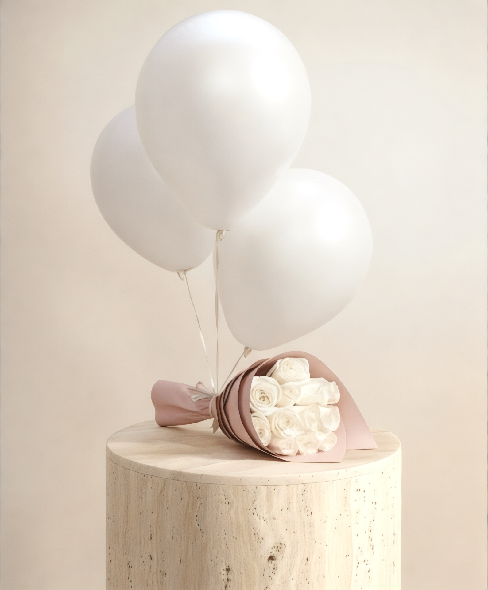 • ثلاث بالونات بيضاء: تطفو بخفة لتضيف إحساساً بالبهجة والاحتفال والمرح، مما يجعلها الهدية المثالية.