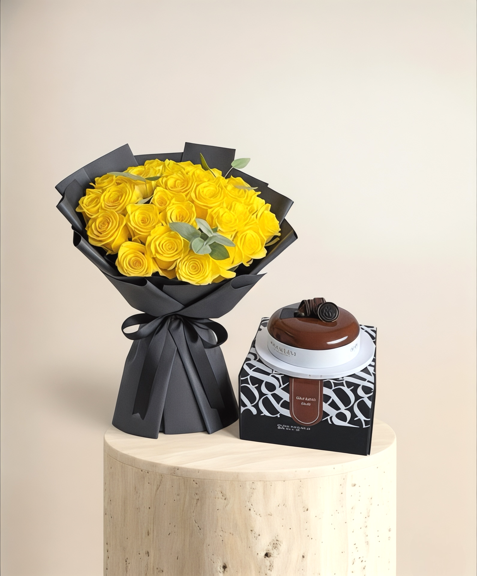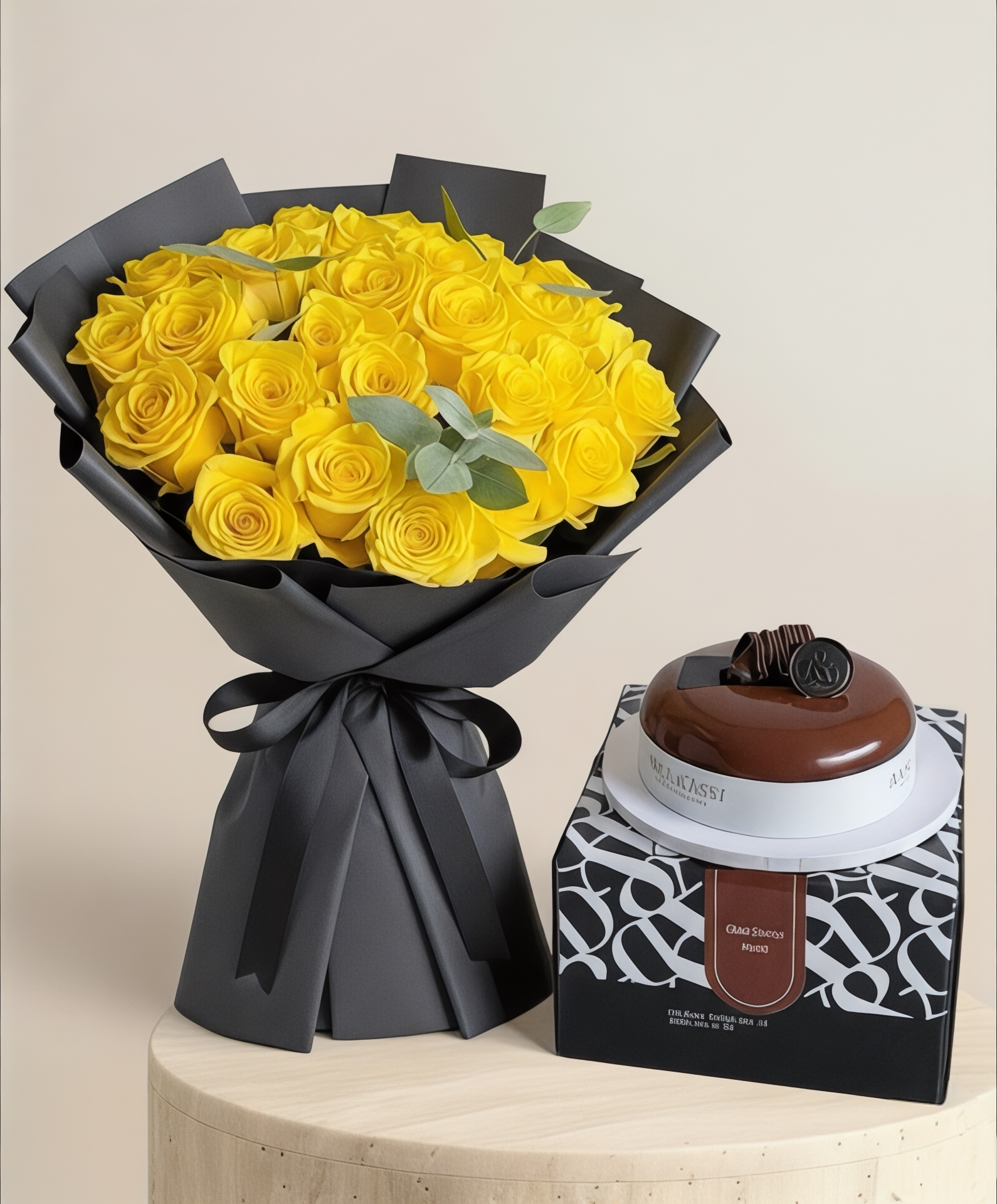 قدم هدية تنبض بالحياة والفخامة مع باقة الجوري الأصفر وكيكة اني وداني . هذا التنسيق هو الخيار الأمثل للتعبير عن مشاعر الفرح، الصداقة، والتهاني القلبية بأسلوب عصري لا يُنسى.
