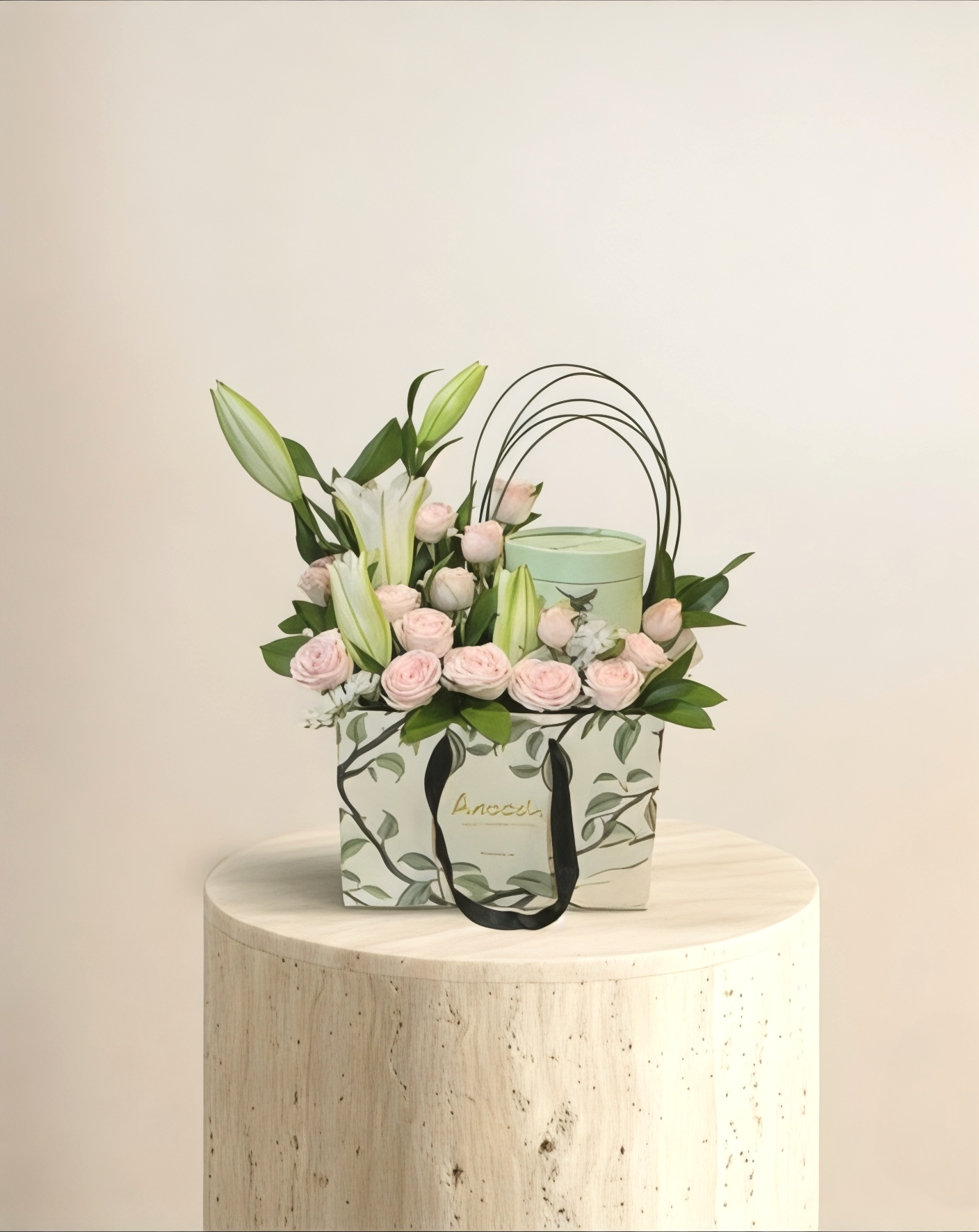 تتميز الباقة بمجموعة غنية من أزهار الجوري الوردي الناعمة (بيبي روز) والزنابق البيضاء الأنيقة، منسقة بانسجام تام مع الأوراق الخضراء النضرة.