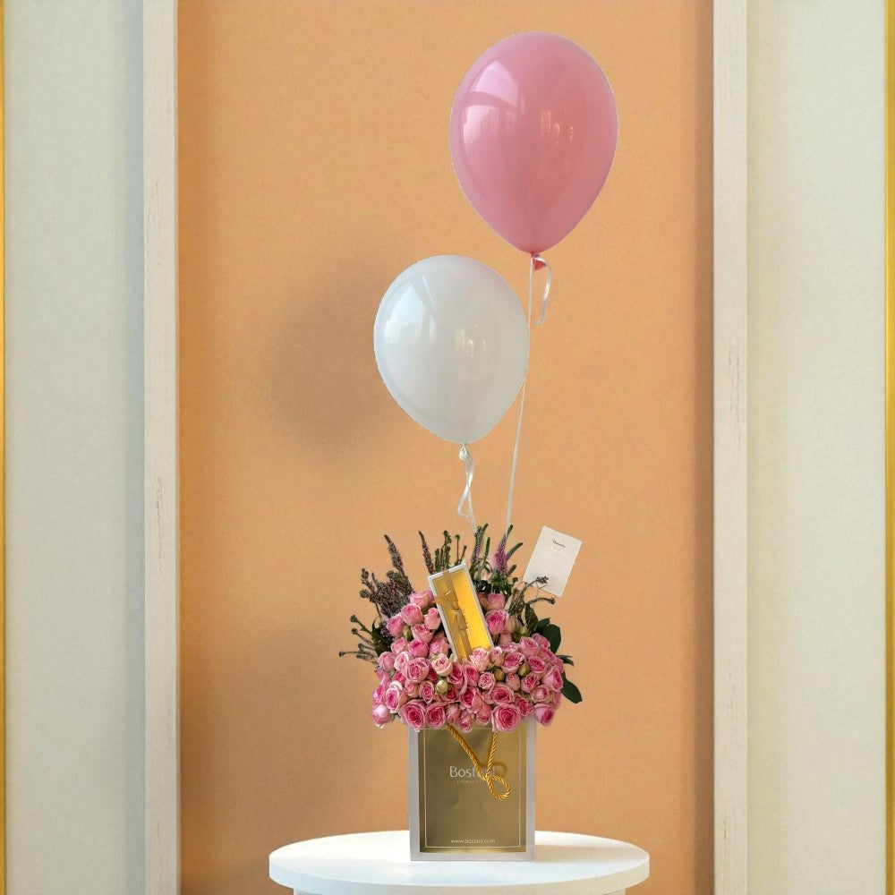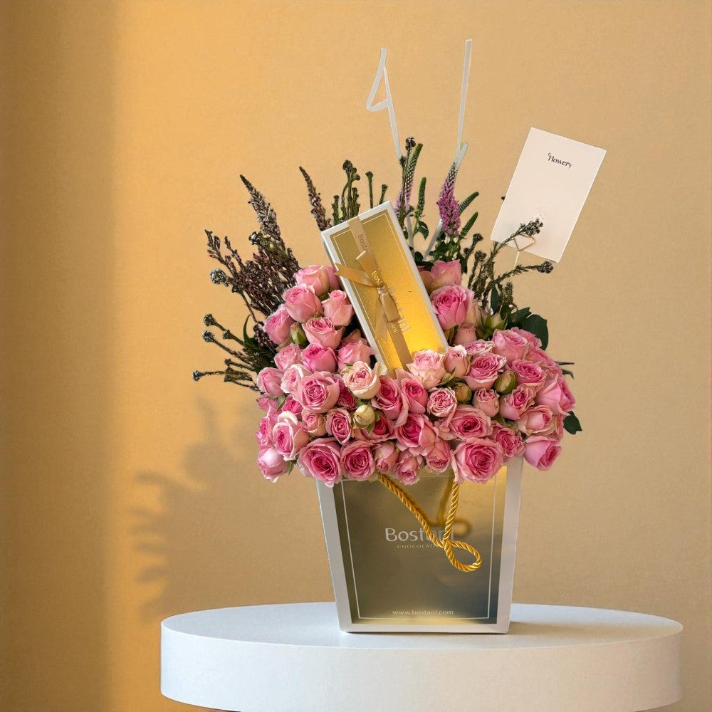 تتناغم أغصان البيبي روز الوردي والسُكّري لترسم لوحة من النعومة والبراءة، وتزينها فراشة رقيقة تضفي عليها لمسة من السحر. تأتي الباقة مع عبارة أكريليك "مبروك المولودة" لتكون ذكرى دائمة، وتكتمل التجربة بعلبة شوكولاتة فاخرة من بستاني.