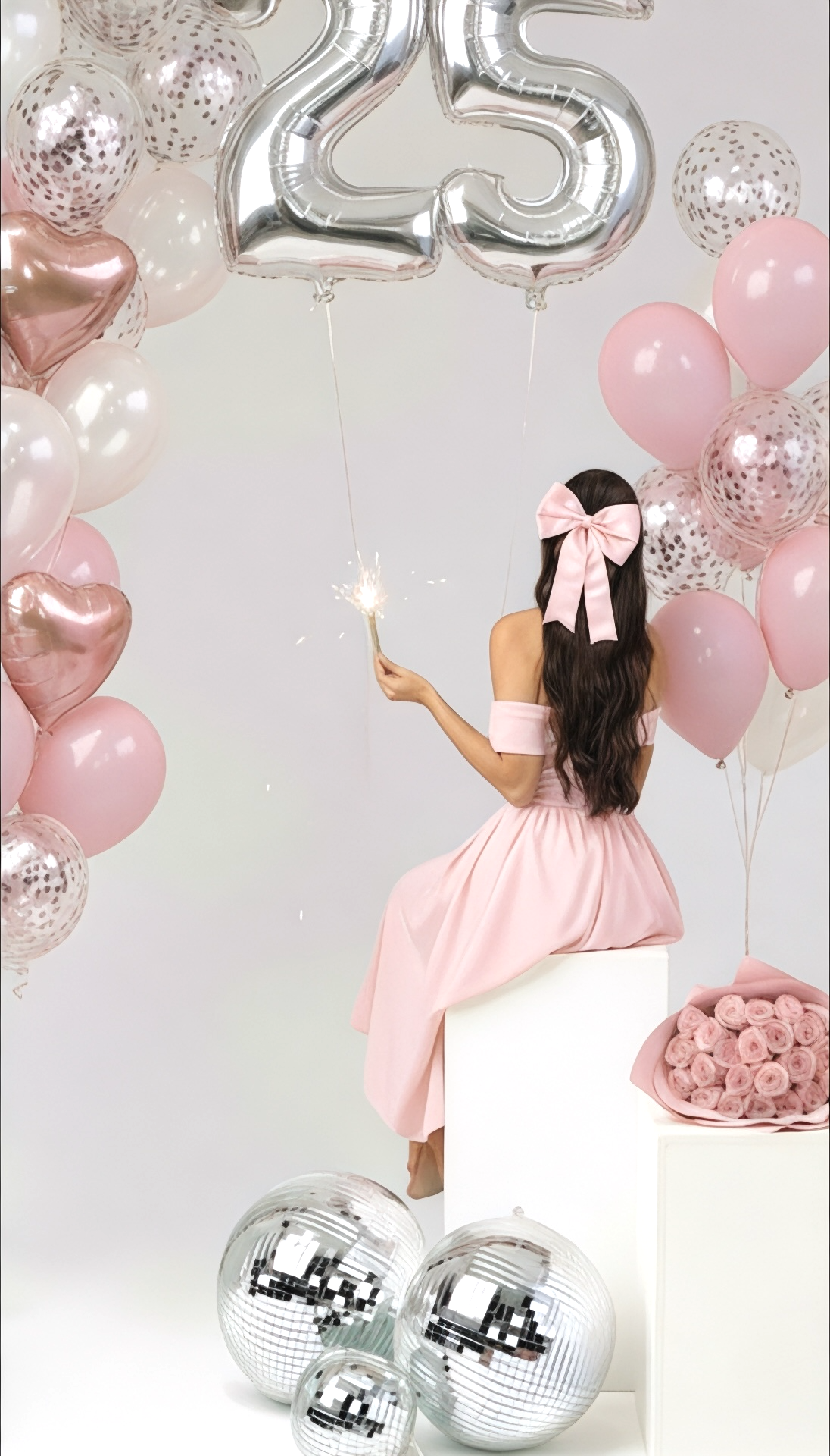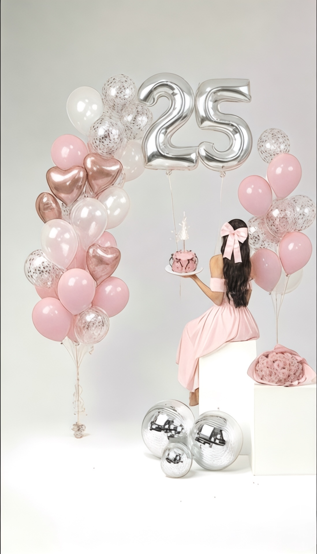 لقد صممنا هذا المشهد الاحتفالي المتكامل لتمنحها ذكرى لا تُنسى. يجمع العرض بين نعومة باقة مكونة من 30 وردة، وتألق بالونات القلوب الوردية والبالونات اللامعة التي ترسم حلماً في الأجواء، مع بالون رقم 25 ليخلد سنتها المميزة.