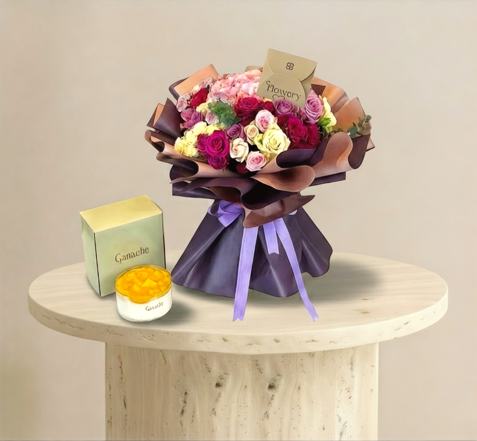 باقة زهور أنيقة وفاخرة مع كيكة مانجو صغيرة، مقدمة كهدية متكاملة
