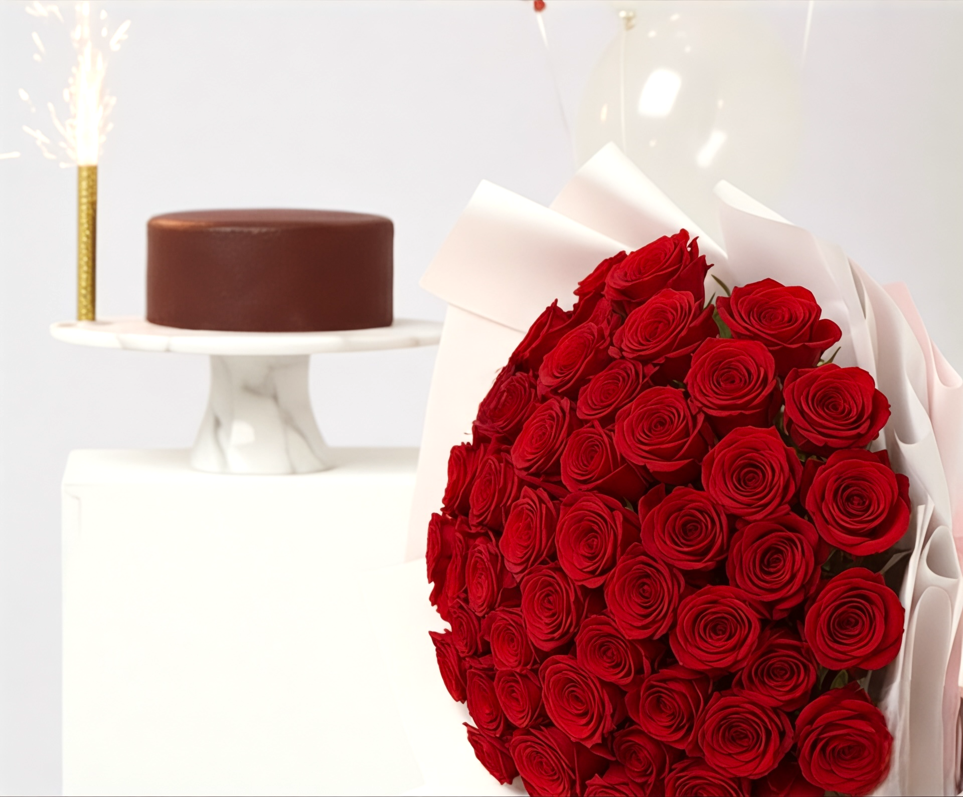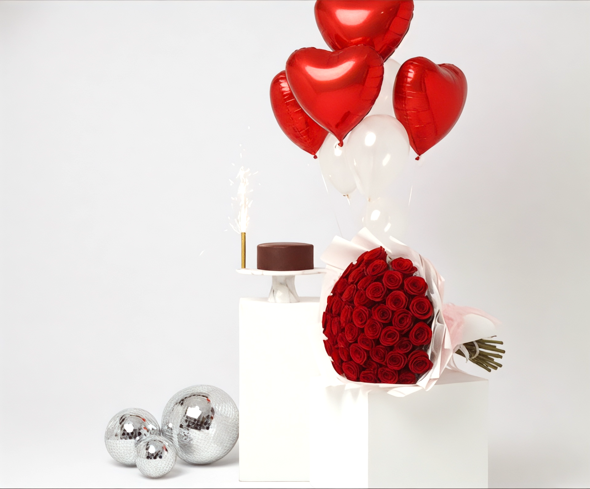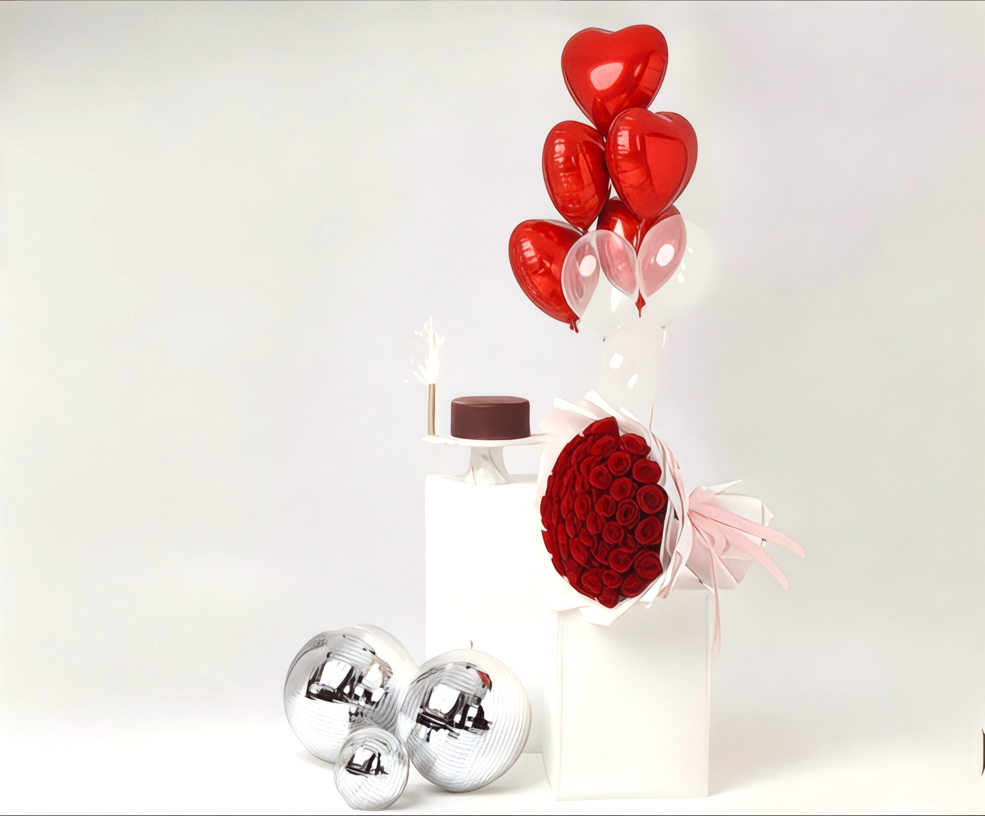 ولتكتمل حلاوة الاحتفال، نرفق معها كيكة منش بالشوكولاتة (حجم وسط) غنية المذاق. ولإضافة لمسة من الرومانسية والبهجة، يأتي التنسيق مع باقة من بالونات الهيليوم (5 بالونات على شكل قلب و 3 بالونات شفافة)، بالإضافة إلى شرارة مضيئة لتبهر شريك حياتك في هذه اللحظة المميزة.