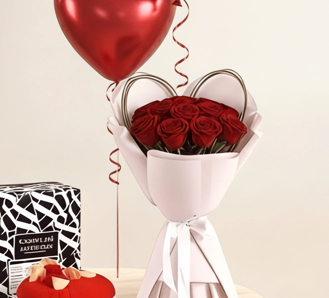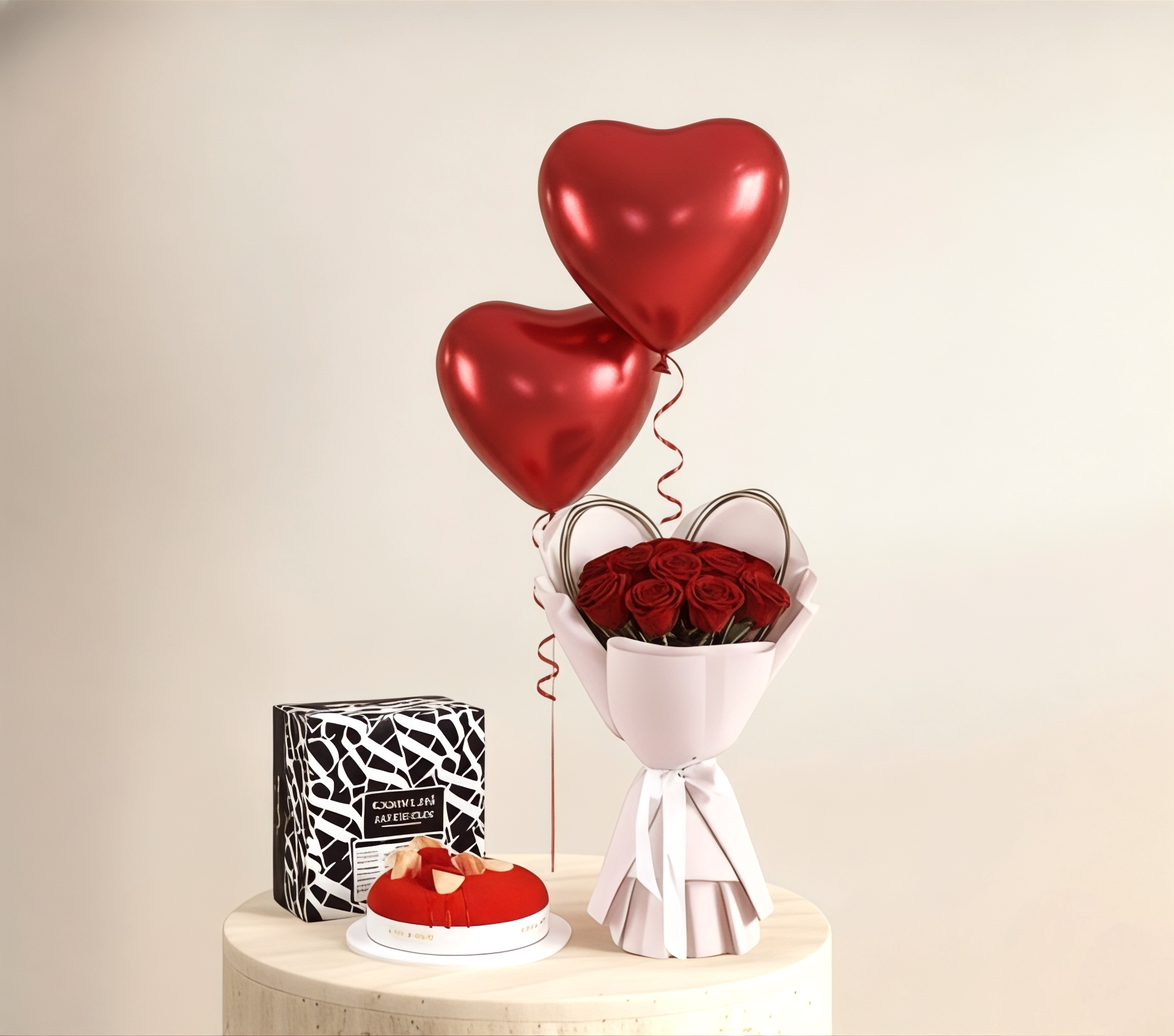 هدية حب جاهزة للمفاجأة: تنسيق حصري يجمع باقة ورد أحمر طبيعي مدمجة في غلاف عصري، كيكة صغيرة حمراء مخملية فاخرة، ، تعلوها بالونات قلب لامعة.