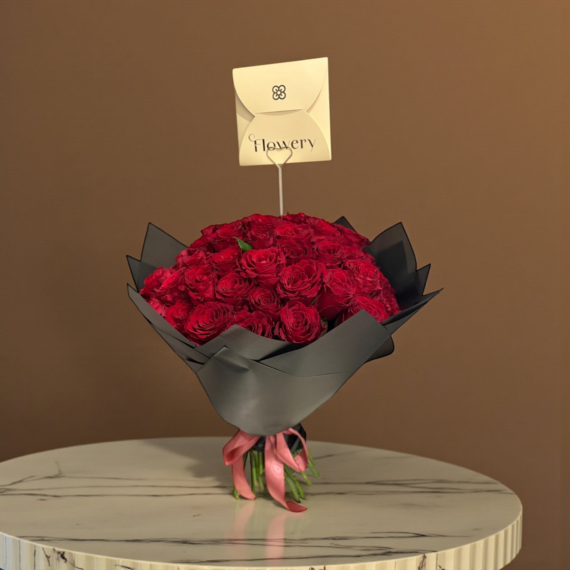 في هذا التصميم الآسر، تجتمع 60 وردة جوري حمراء لتشكل بحراً من العاطفة المتأججة. ولإبراز جمال هذا اللون الأحمر القاني، قمنا باحتضانه بتغليف أسود ملكي فاخر، يخلق تبايناً درامياً يخطف الأنظار ويضفي هالة من الغموض والجاذبية.