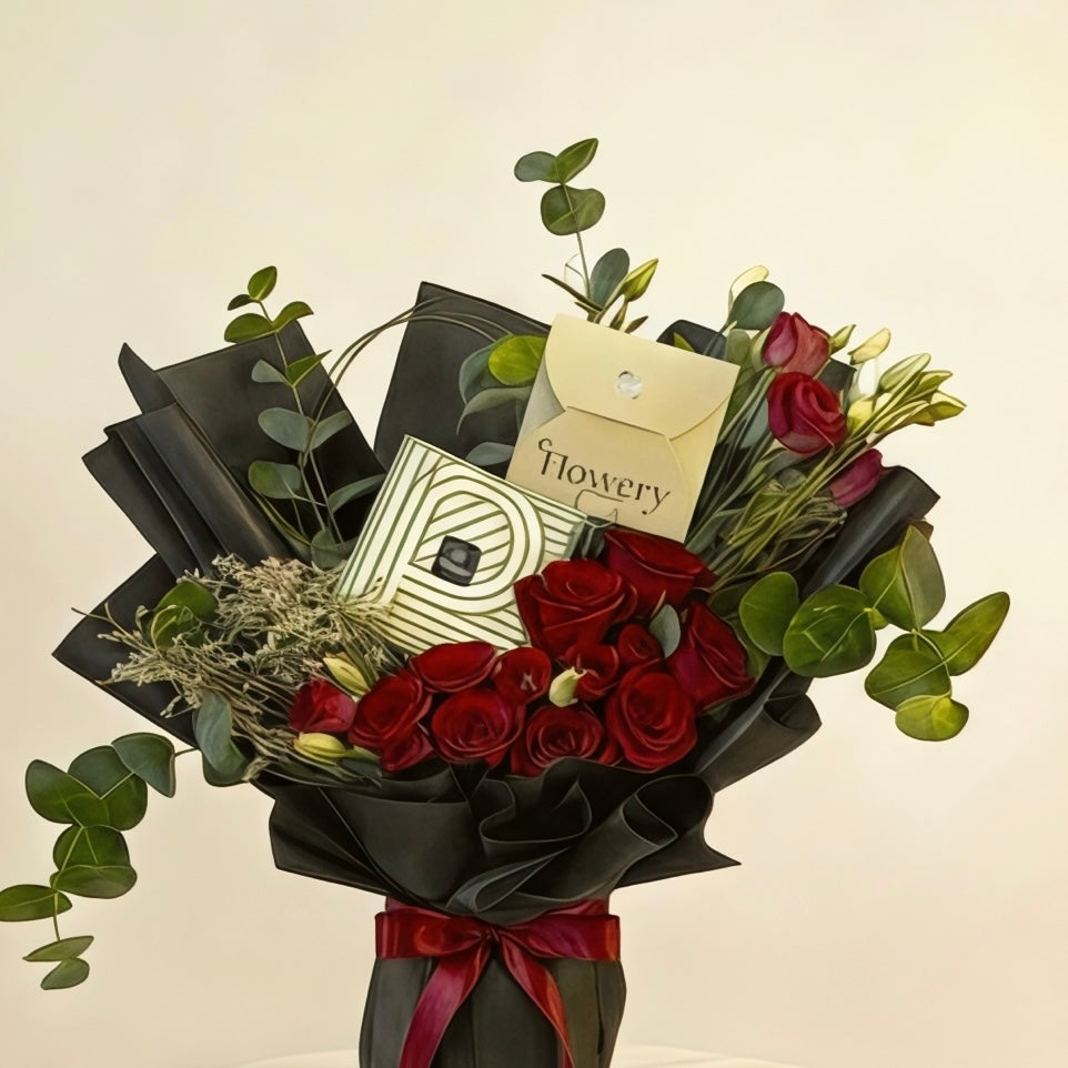 بوكية ورد مع شوكلاتة باتشي هي مزيج استثنائي من جمال الورد الاحمر ولمسة من الفخامة مع شوكولاتة باتشي.