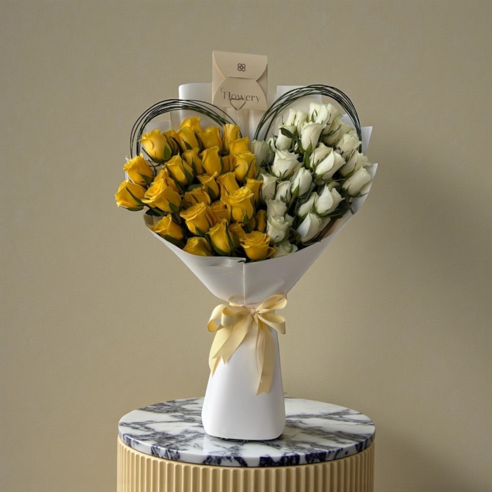 باقة "التناغم الملكي" هي تحفة بصرية تجسد أقصى درجات الرقي. في هذا التنسيق البديع، صغنا لك توازاً ساحراً يجمع بين عالمين: 25 وردة صفراء تنبض بالحياة والإشراق، تعانقها 25 وردة بيضاء ترمز للسكينة والصفاء.