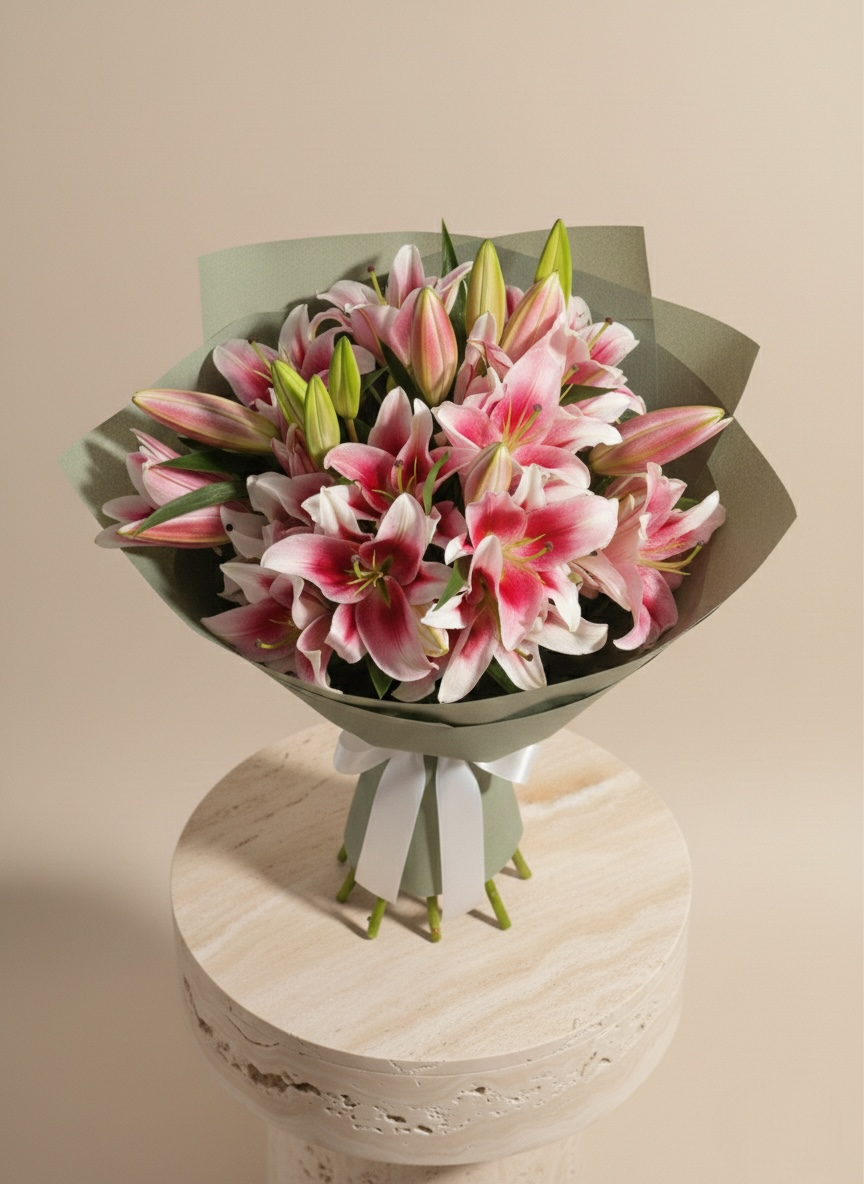 استمتعي بسحر الطبيعة الأخاذ مع باقة "نسمات الليليوم"، التي تضم زهور الليليوم (الزنبق) الوردية المنعشة بتفاصيلها الساحرة وعبيرها الذي يملأ المكان. تتميز الباقة بتنسيق مرتفع يبرز جمال بتلاتها الكبيرة وتدرجات اللون الوردي بداخلها، مع تغليف أخضر زيتوني هادئ يمنحها لمسة عصرية مستوحاة من الطبيعة. تُعد هذه الباقة الخيار المثالي للمناسبات الراقية، هدايا التخرج، أو للتعبير عن التقدير الخالص بأسلوب يجمع بين البساطة والفخامة.
