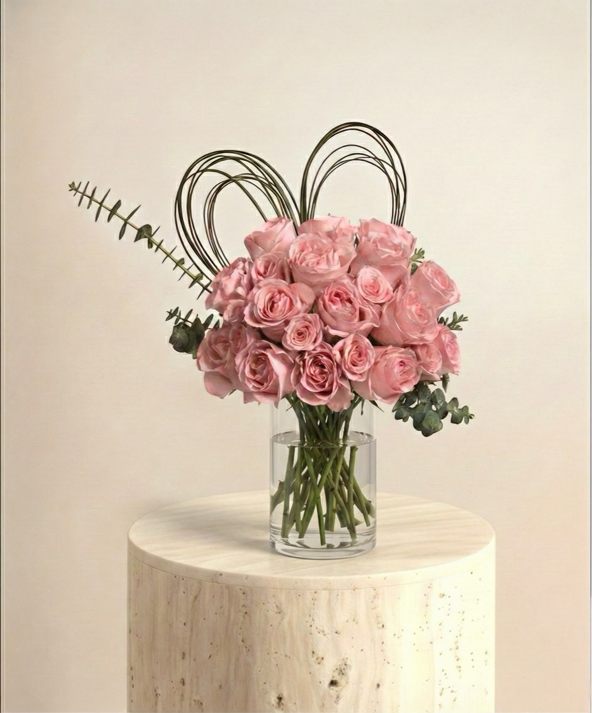 عبر عن أرق مشاعرك مع باقة "همسات وردية" الساحرة، التي تجمع بين الكلاسيكية واللمسة العصرية. تتألق هذه الباقة الفاخرة بمجموعة كثيفة من الورد الجوري الوردي (Pink Roses) ذي التدرجات اللونية الناعمة، منسقة بعناية فائقة داخل فازة زجاجية أسطوانية شفافة