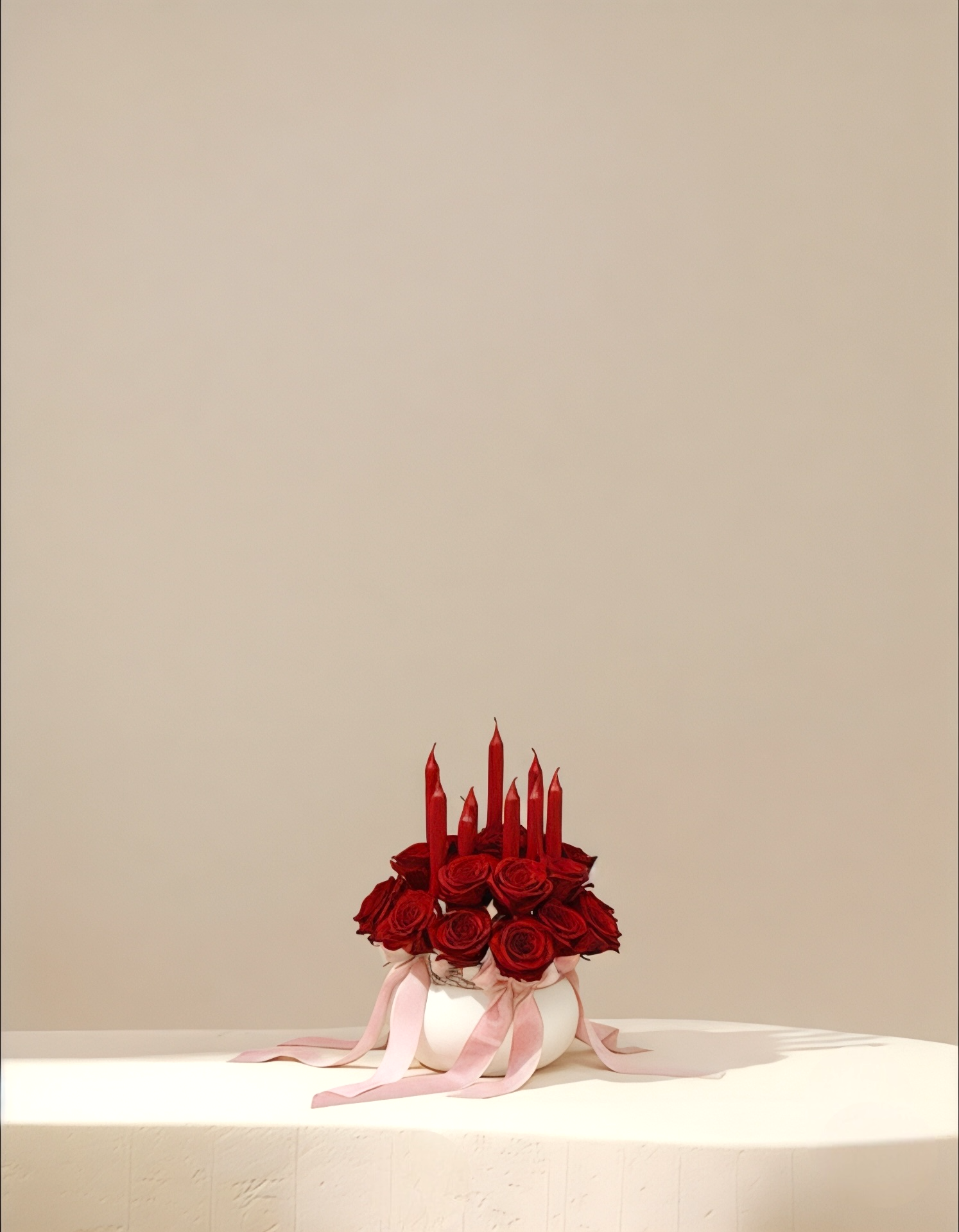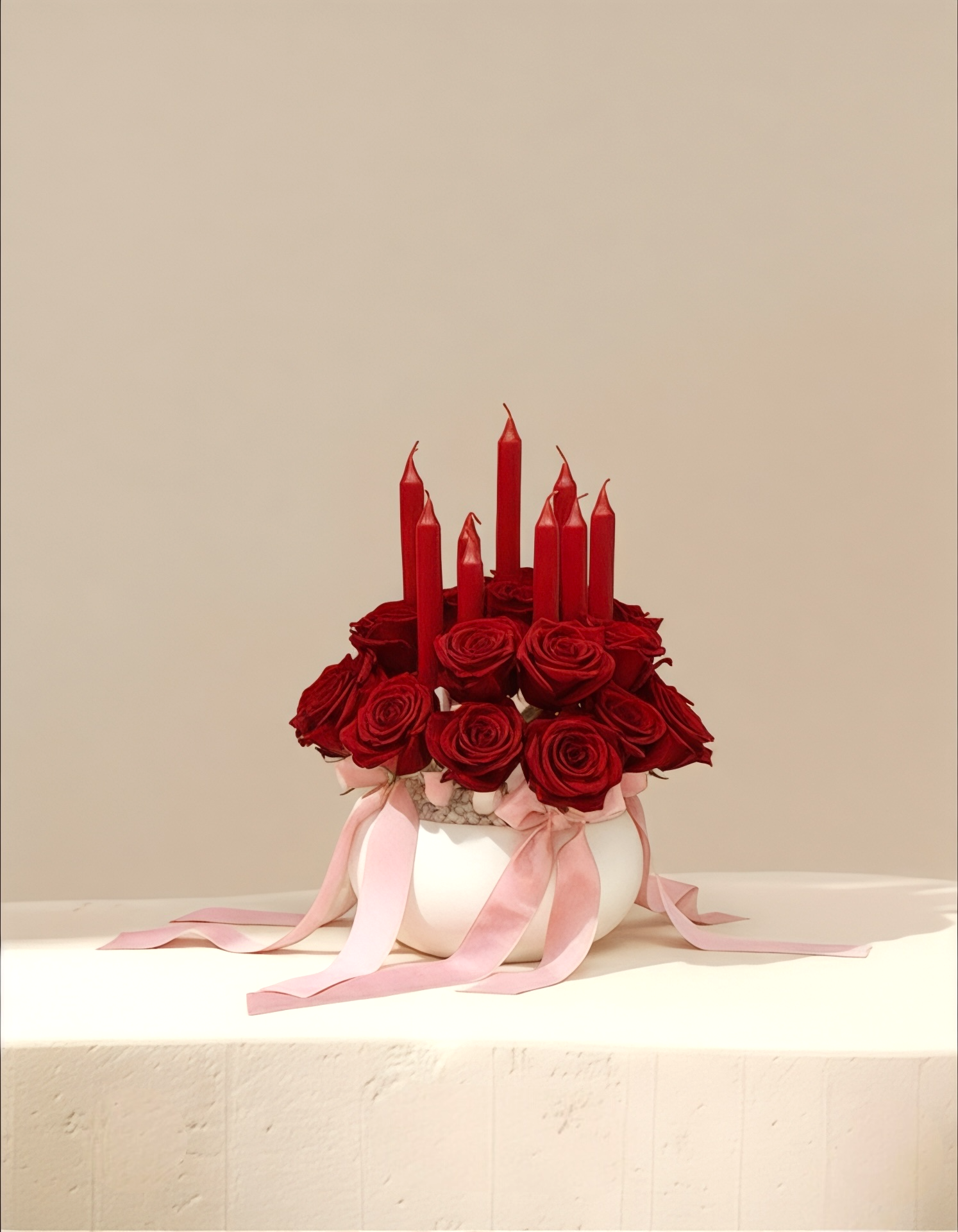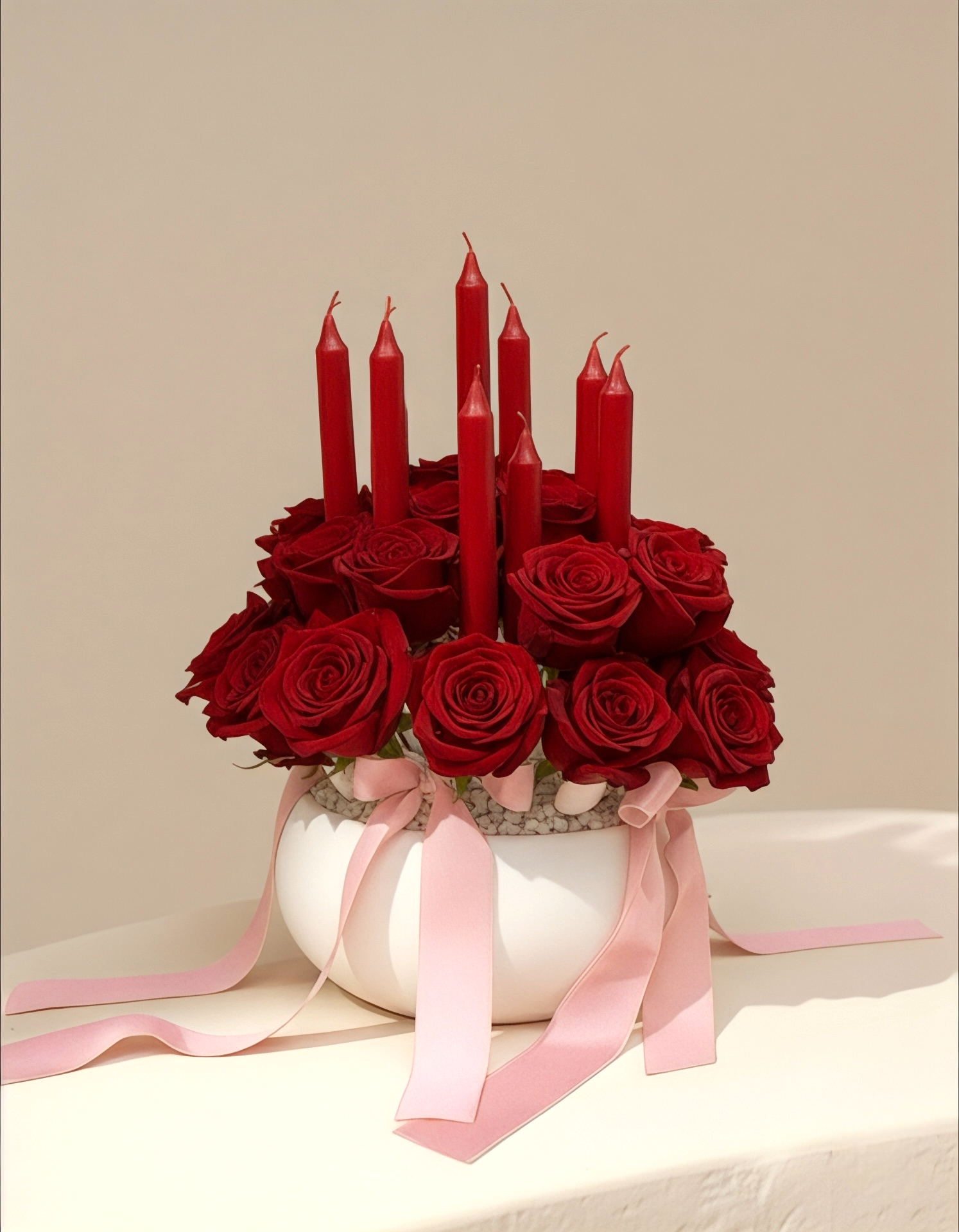 يأتي هذا التنسيق الفاخر في فازة بيضاء كروية أنيقة، تبرز جمال اللون الأحمر العميق للورود والشموع. تُغطي قاعدة التنسيق طبقة من الحصى الأبيض النقي، مع شرائط وردية ناعمة تلتف حول الفازة لتضيف لمسة من الرقة والكمال.