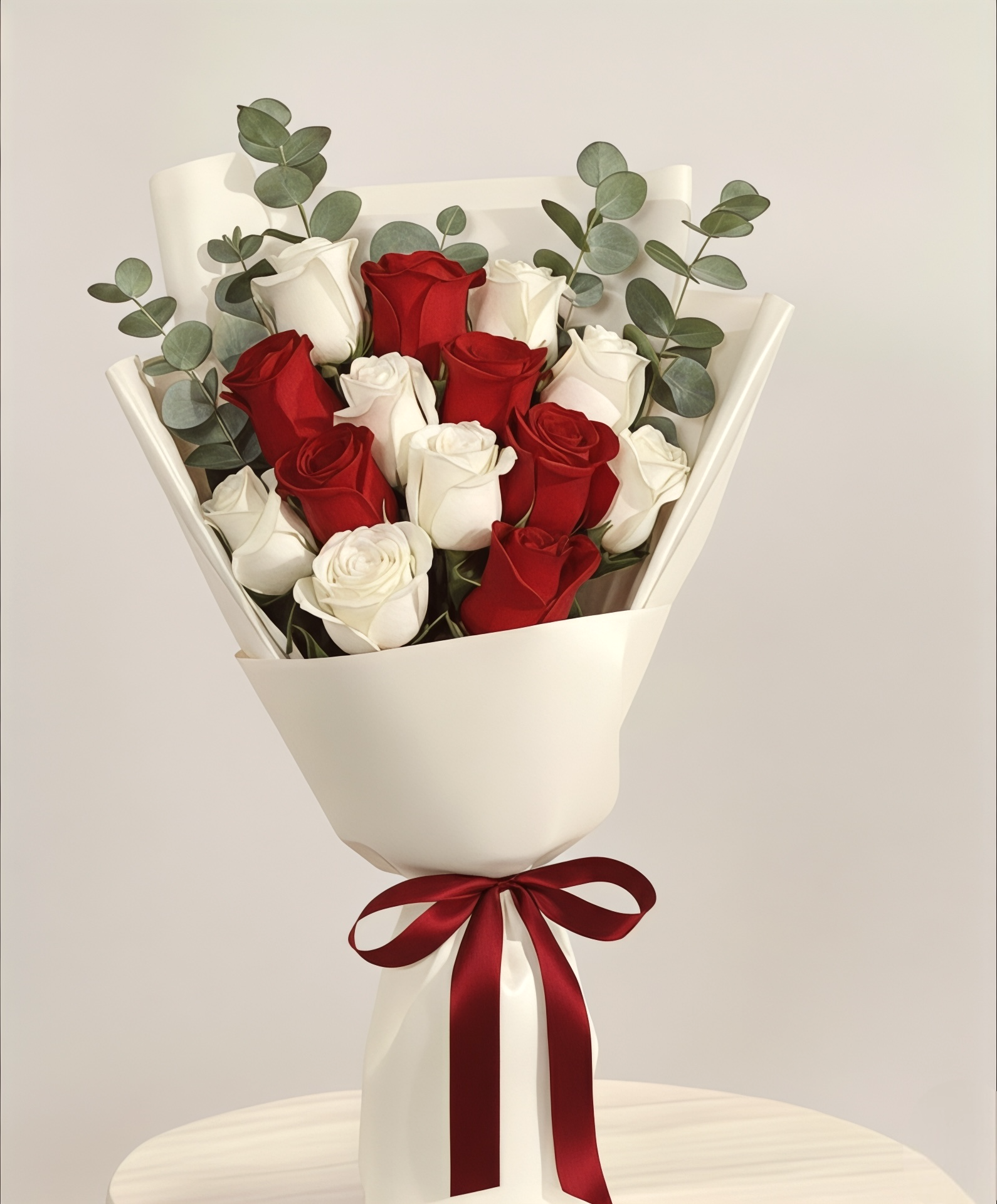 استمتع بجمال يجمع بين الفخامة والبساطة مع باقتنا المختارة بعناية، والتي تضم أجود أنواع الورد الجوري الأحمر والأبيض. تم تنسيق هذه الباقة يدوياً مع أغصان اليوكاليبتوس الخضراء لتمنحك رائحة طبيعية ومظراً عصرياً جذاباً. مغلفة بورق فاخر باللون الأبيض الناصع ومزينة بشريط ساتان أحمر، مما يجعلها الهدية المثالية للتعبير عن الحب، التهاني، أو المناسبات الخاصة.