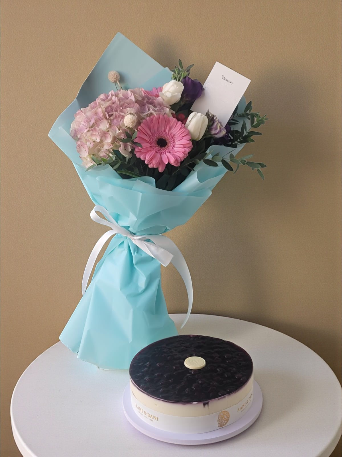 باقة ورد بتنسيق أنيق وألوان مبهجة، ترافقها كيكة مميزة بطعم لا يُنسى – خيار مثالي للتهنئة بالمولود، عيد الميلاد، أو أي مناسبة تستحق الاحتفال.